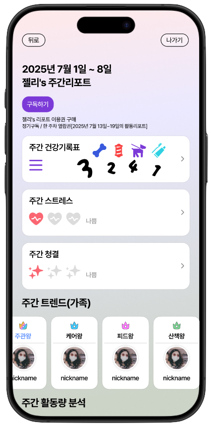 반려동물의 활동과 건강상태를 한 눈에 확인할 수 있는 리포트를 제공합니다.