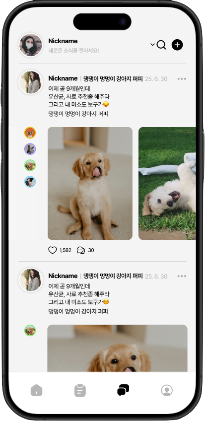 반려동물 관련 사진이나 글을 올릴 수 있습니다. 다른 반려인들과 소통하며 정보를 공유할 수 있습니다.
