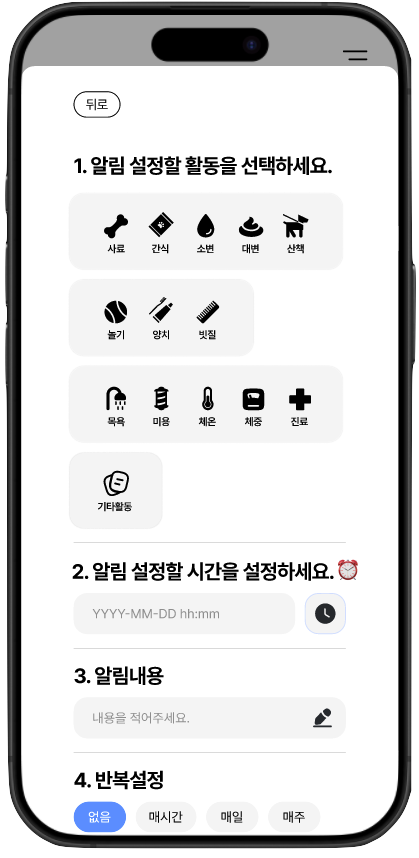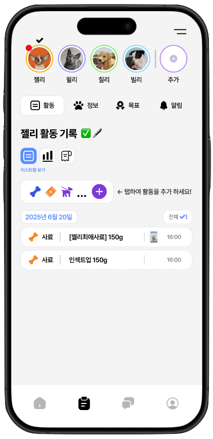 반려동물별 일정을 등록하고, 해당 내용을 수행하면 반려동물 활동 내용에 바로 저장되어 관리됩니다.