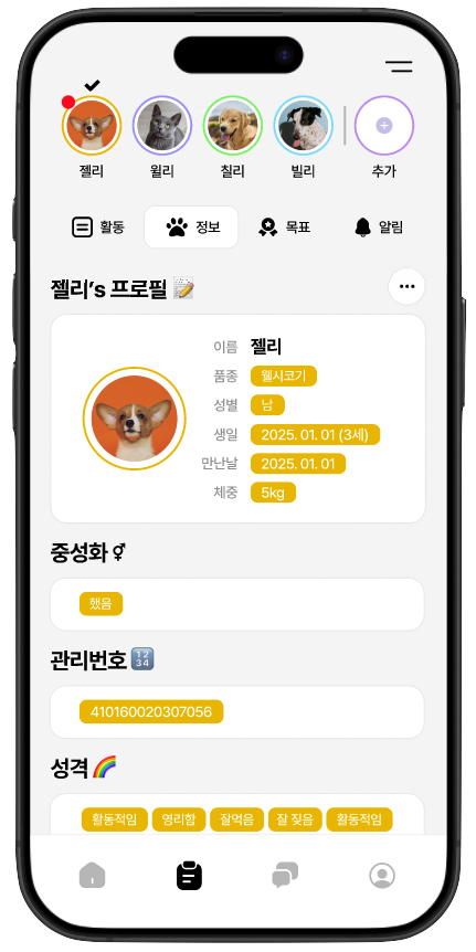 사랑하는 반려동물과 이를 관리할 가족들을 등록하여 반려동물에 대한 모든 활동을 주고받을 수 있습니다.