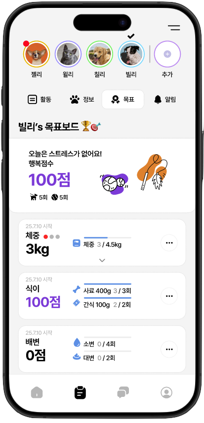 반려동물과 목표를 설정하여 함께 달성하며 반려동물과 추억을 쌓을 수 있습니다.