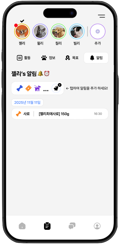 반려동물의 정보를 기반으로 맞춤형 알림 서비스가 제공됩니다. 놓치기 쉬운 내용들이 알림으로 받을 수 있습니다.