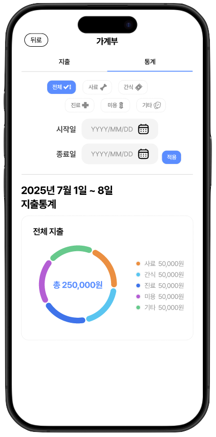 반려동물의 사료/간식 등의 제품을 관리할 수 있으며, 진료/미용 내용으로 가계부가 만들어집니다. 상세 내용과 그래프를 한눈에 볼 수 있습니다.